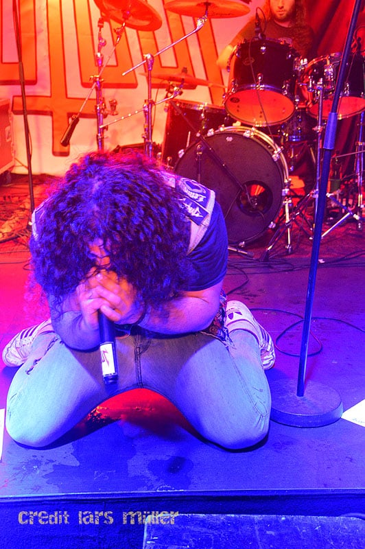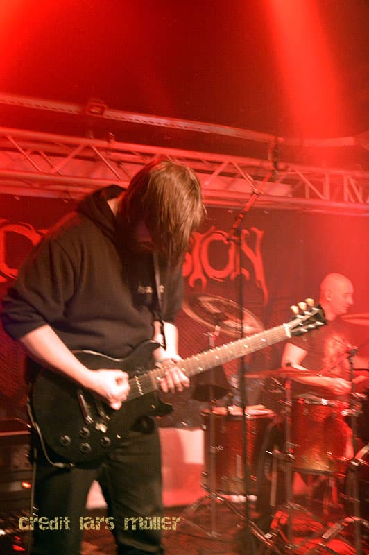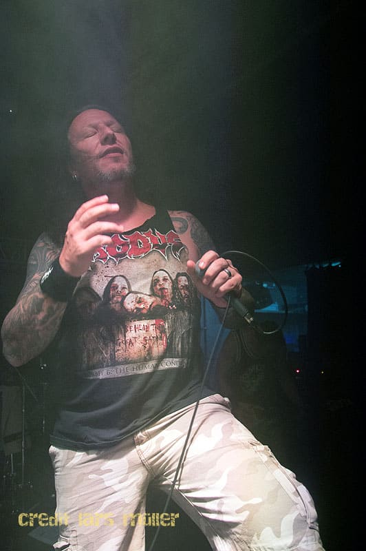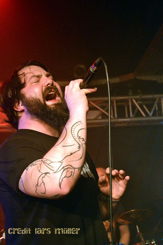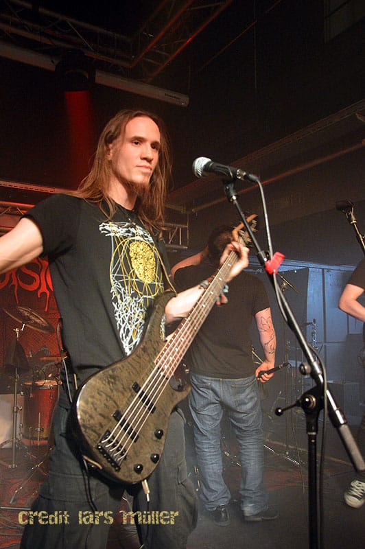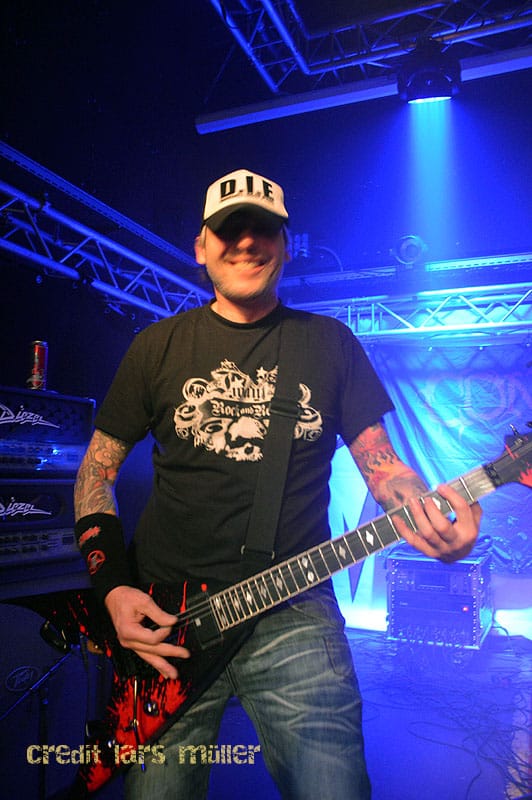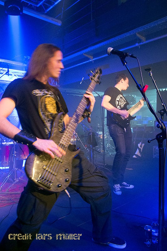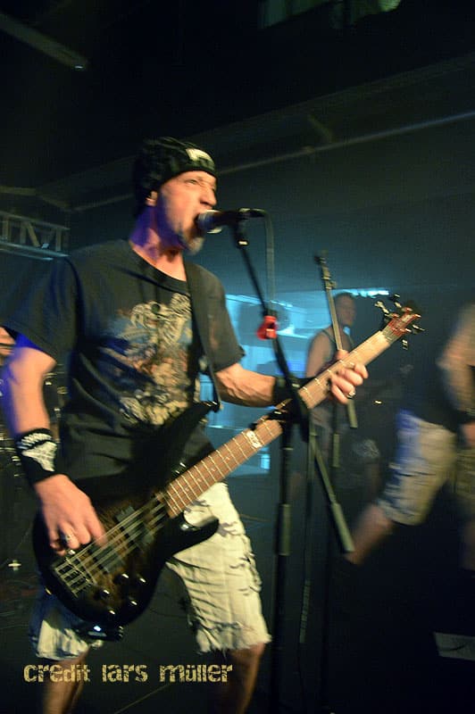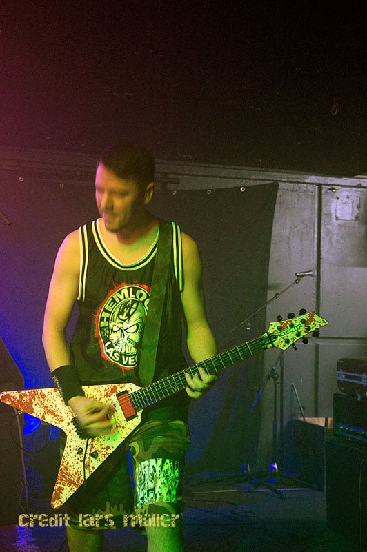 Da es vor der Bühne sehr viel Platz hatte, dachte sich wohl auch der Vollbärtige Basser Flo, dass man soh die Bühne erweitern könne. Mit Erfolg. Da in letzter Zeit eine regelrechte Grippenwelle umherzog, schien es so, als hätte es auch keinen halt vor Sänger Mike gemacht. Zwischendurch hustete auch er immer wieder. Zum Glück gab es keinen Abriss bei seiner brachialen Stimme.