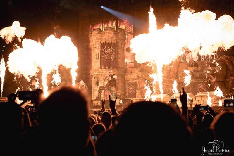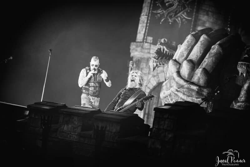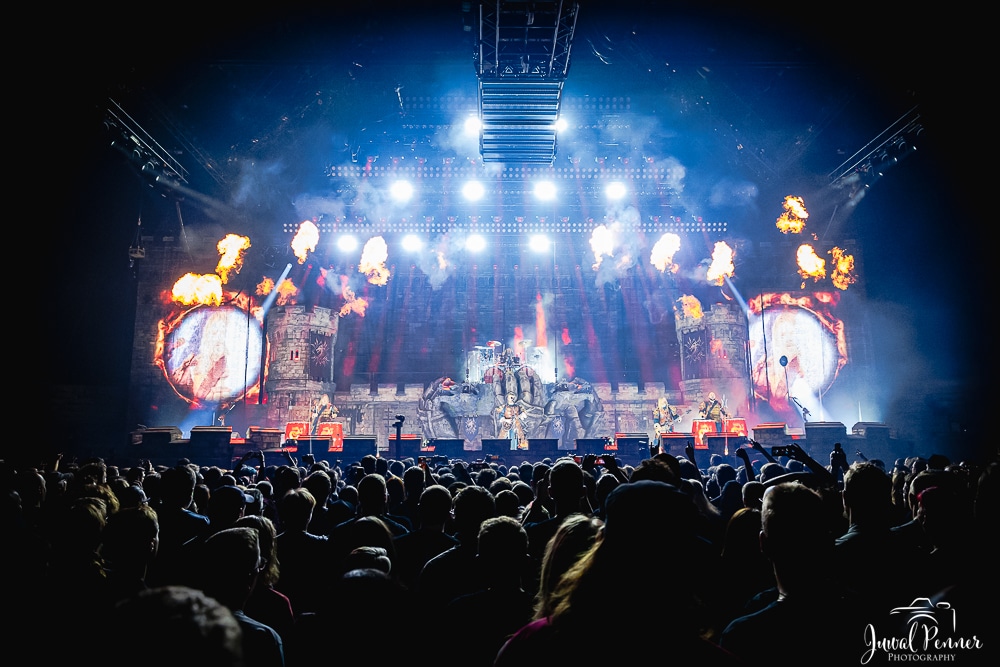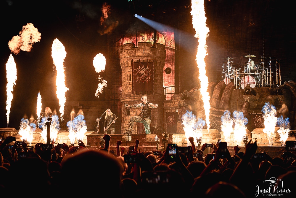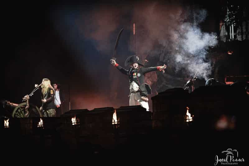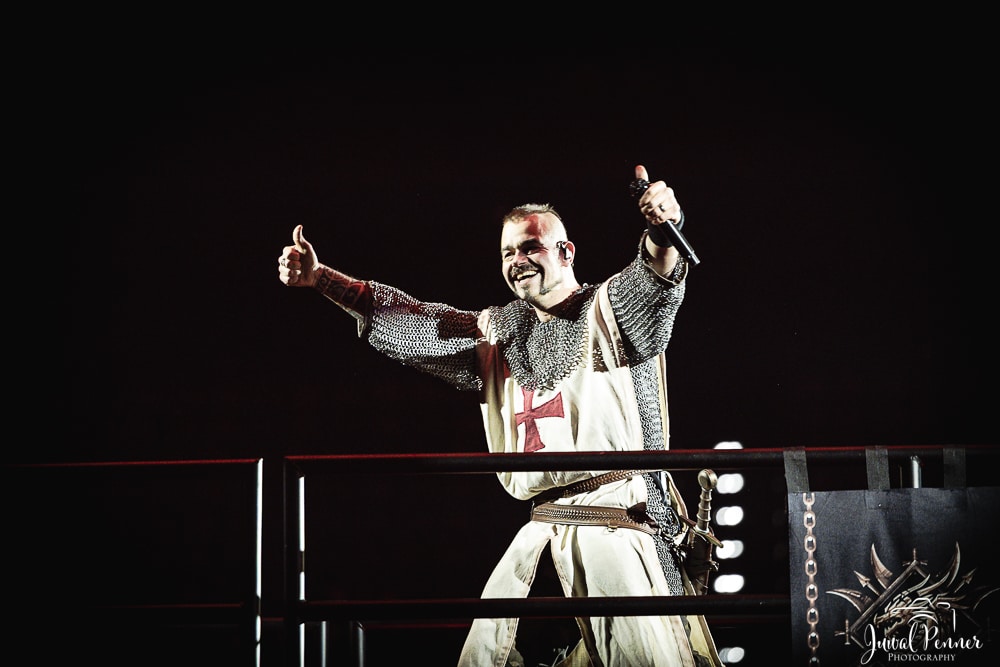 Nach einer längeren Umbaupause ist es nun Zeit für die schwedische Kriegsmaschinerie Sabaton. Das Konzert beginnt mit einem doch eher ungewöhnlichen Intro. Inmitten des Hallenstadions betreten nacheinander Cäsar, Dschingis Khan und Napoleon die Bühne. Sie erzählen über sich und bekämpfen sich gegenseitig. Am Ende dieser Inszenierung betreten Tempelritter die Bühne in der Mitte, welche sich als Sabaton herausstellen und beginnen direkt mit dem ersten Lied. Ich glaube, es ist das erste Mal, dass ich die Band sehe, ohne dass mit Ghost Division gestartet wird. Über eine B-Stage (welche immer mal wieder herauf- und herabgeht während des Konzertes) geht die Band auf die Hauptbühne um die Halle in Flammen zu setzen.