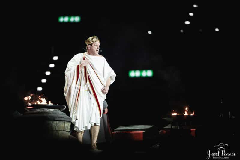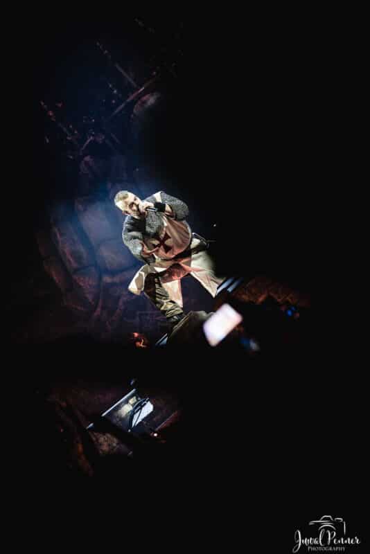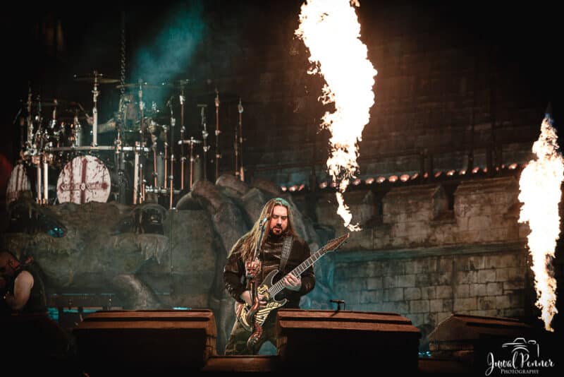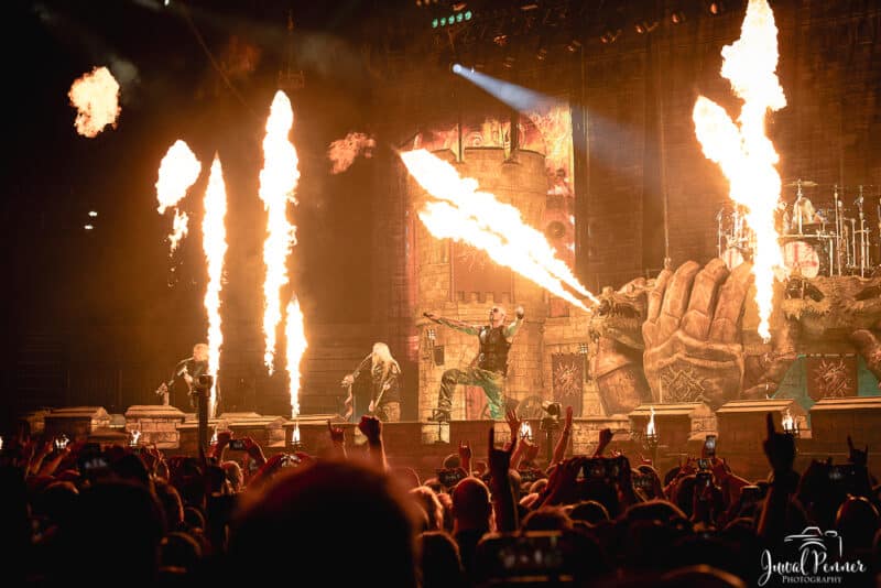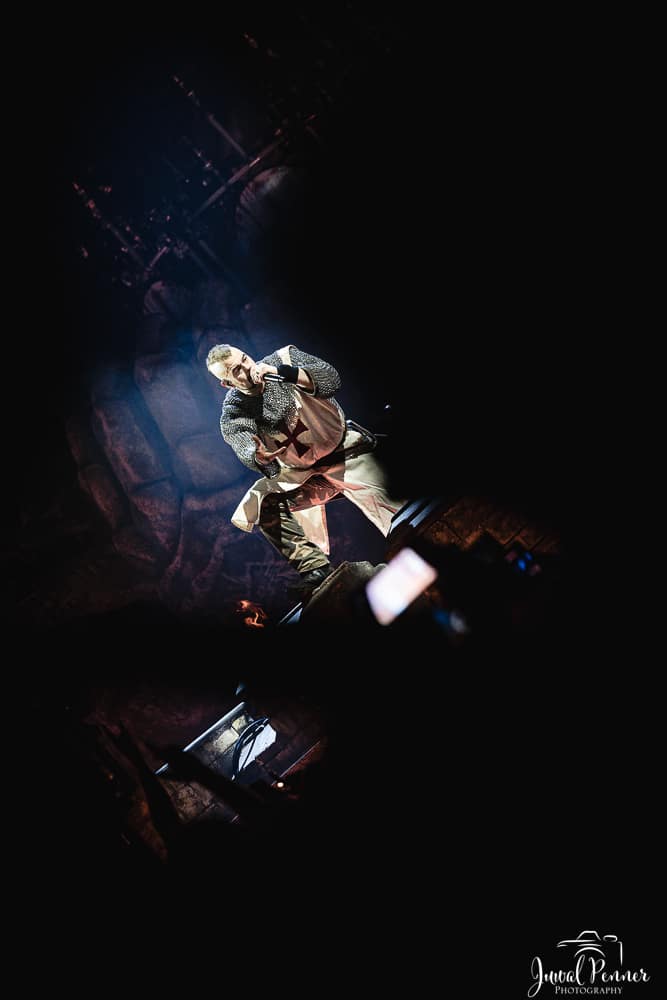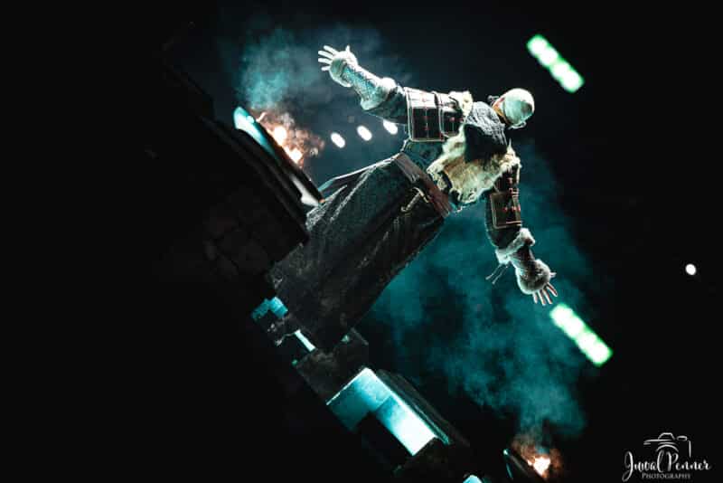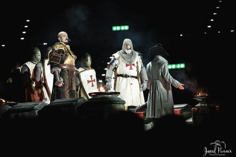 Nach einer längeren Umbaupause ist es nun Zeit für die schwedische Kriegsmaschinerie Sabaton. Das Konzert beginnt mit einem doch eher ungewöhnlichen Intro. Inmitten des Hallenstadions betreten nacheinander Cäsar, Dschingis Khan und Napoleon die Bühne. Sie erzählen über sich und bekämpfen sich gegenseitig. Am Ende dieser Inszenierung betreten Tempelritter die Bühne in der Mitte, welche sich als Sabaton herausstellen und beginnen direkt mit dem ersten Lied. Ich glaube, es ist das erste Mal, dass ich die Band sehe, ohne dass mit Ghost Division gestartet wird. Über eine B-Stage (welche immer mal wieder herauf- und herabgeht während des Konzertes) geht die Band auf die Hauptbühne um die Halle in Flammen zu setzen.