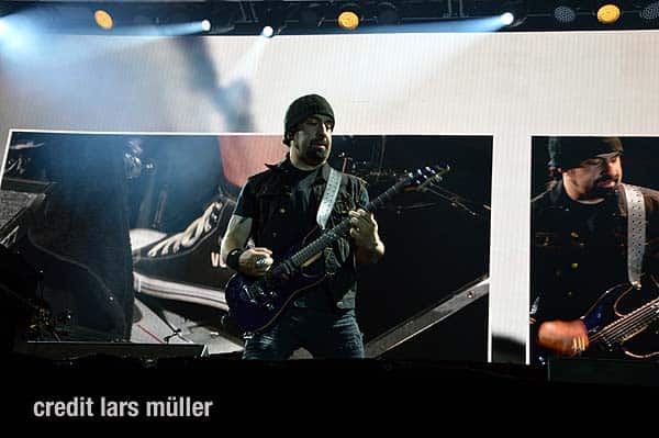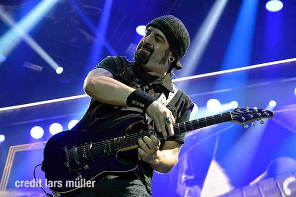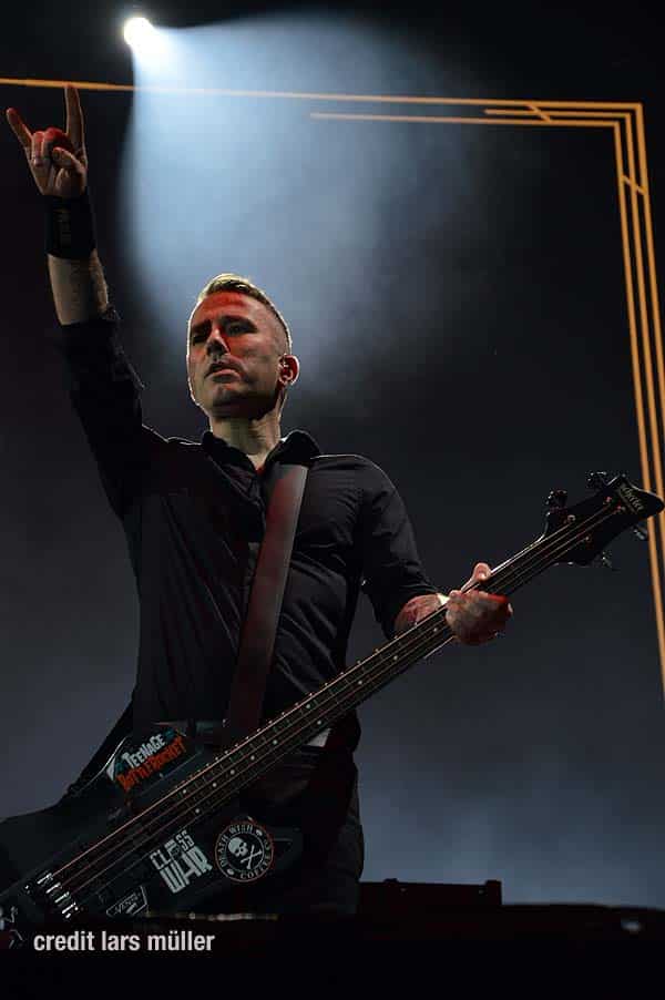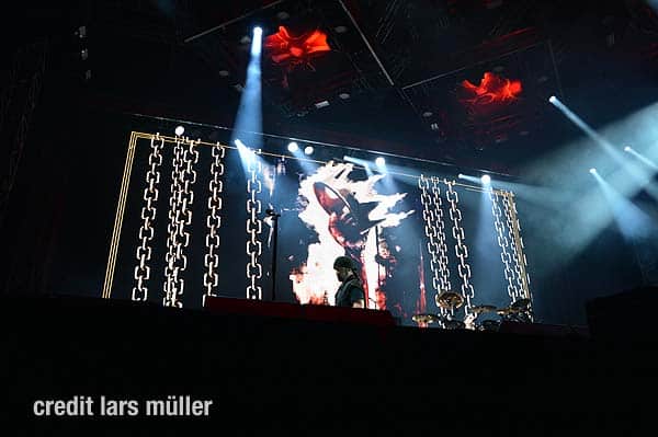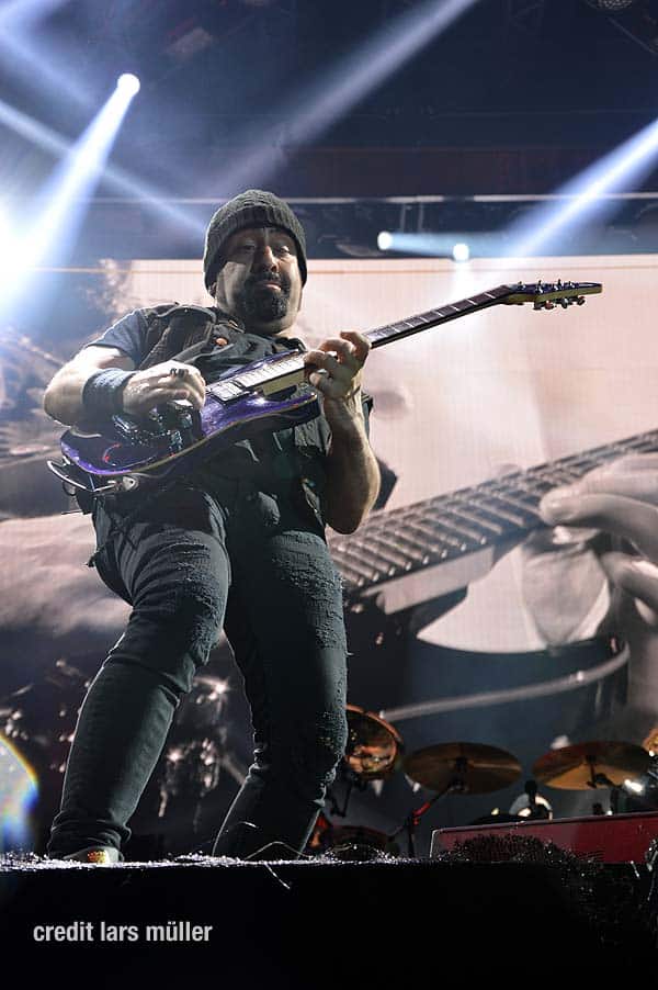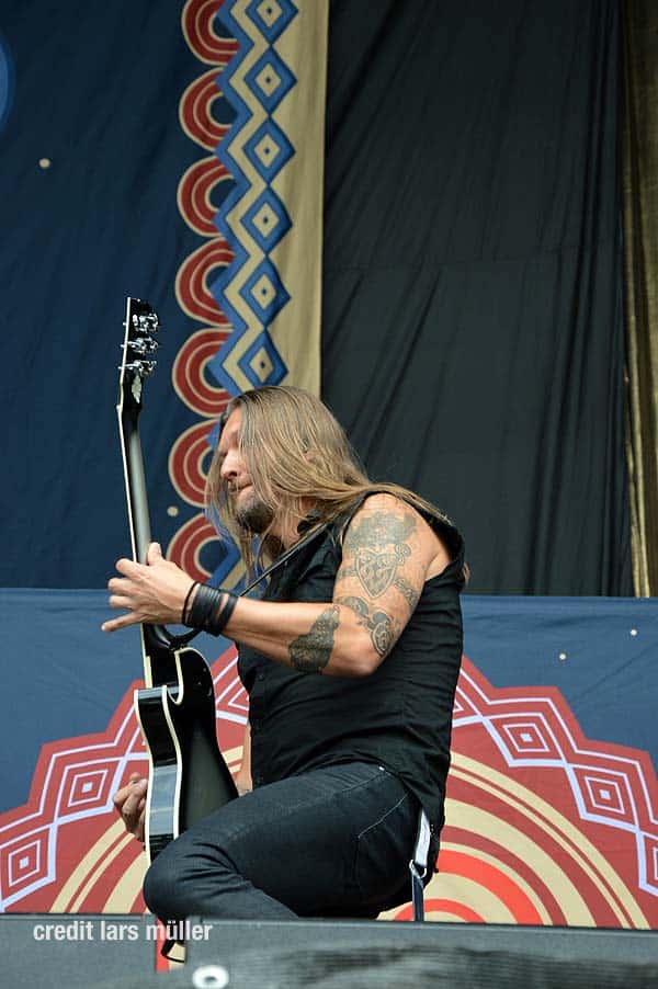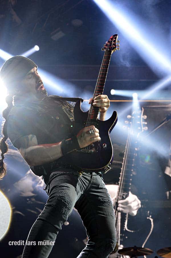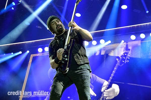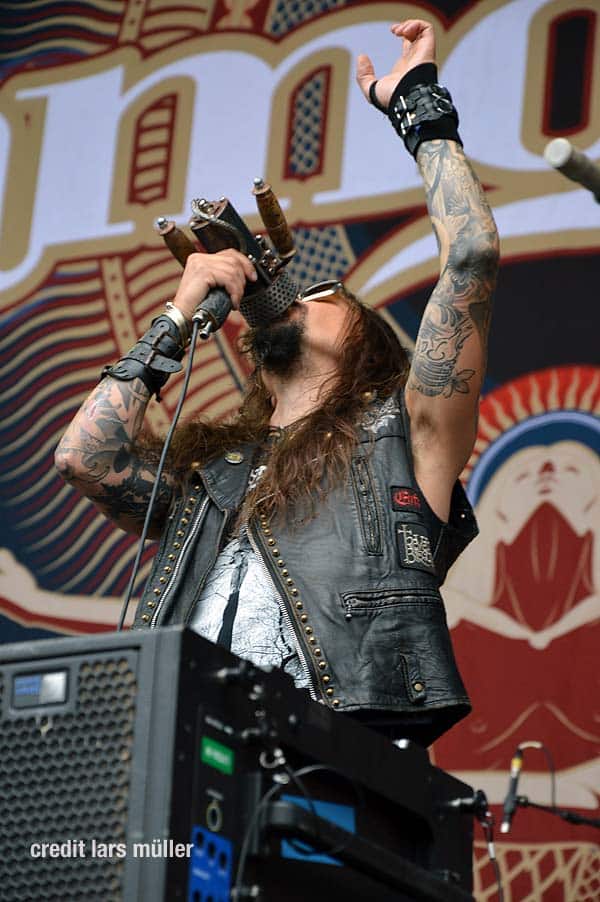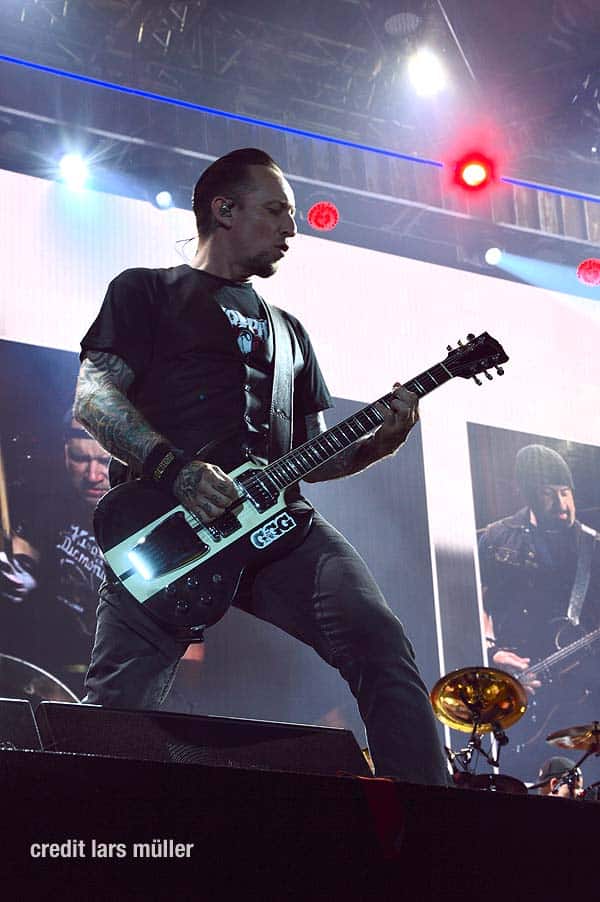 Wie gewohnt verdeckte ein riesiger VOLBEAT Vorhang die Bühne. Als Intro lief der Song „Born to raise Hell“ von MOTÖRHEAD. Als der Vorhang fiel, sah man kurz auf einem riesigen Screan die Schweizer Flagge und dazu lief der Song „Devil’s Bleeding Crown“. Bisher alles wie gewohnt.