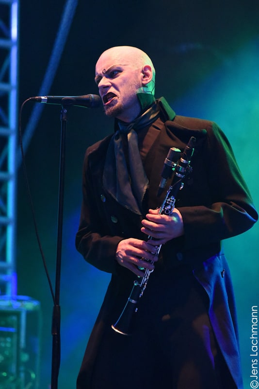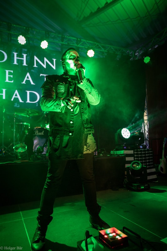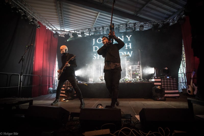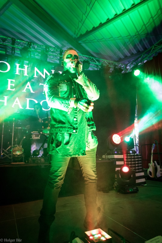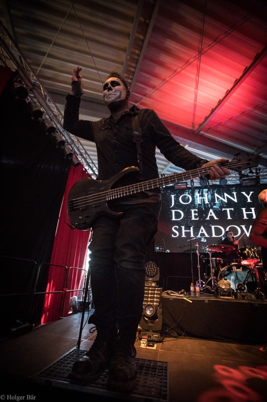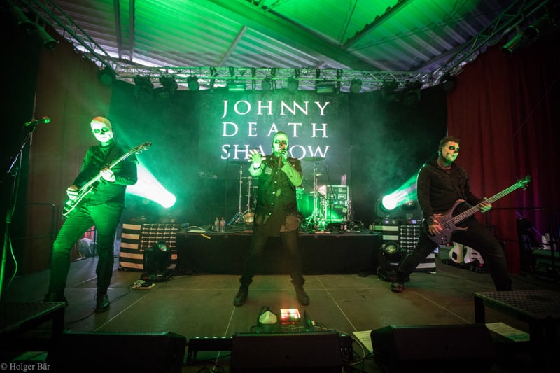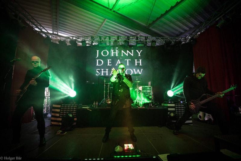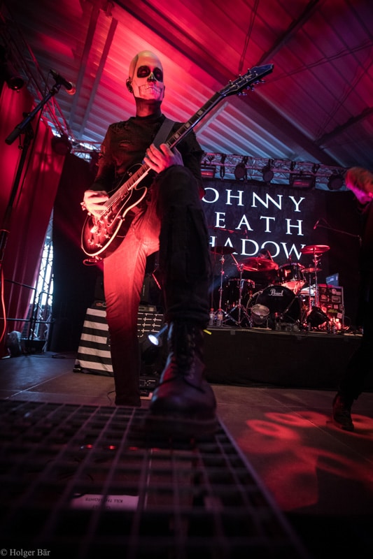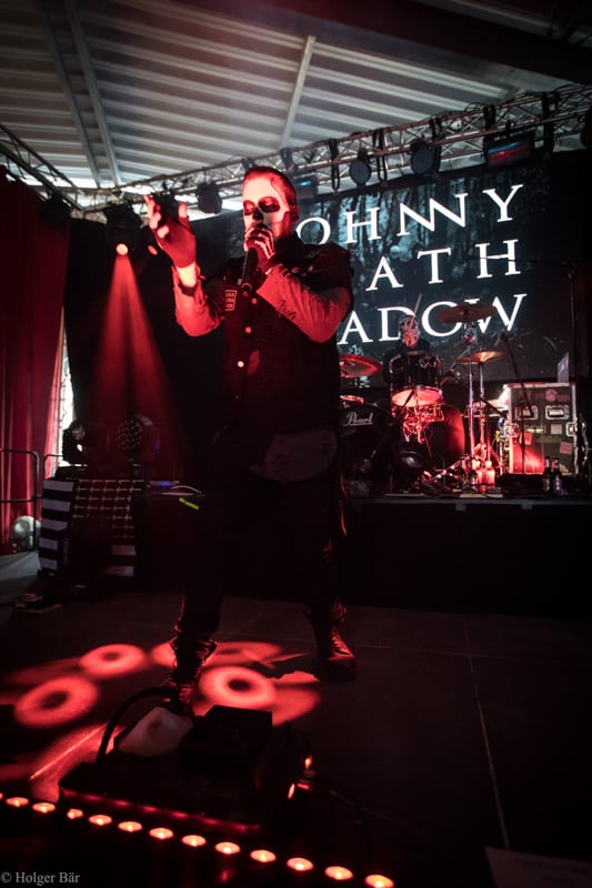 Ehe das musikalische Programm am Samstag beginnt, wagen wir trotz der Kälte einen kleinen Spaziergang über den Mittelaltermarkt. Wie schon im vergangenen Jahr hielt man diesen auf dem Hauptgelände recht weitläufig und überschaubar, stattdessen gab es auf dem Außengelände viel Freiraum zum Verweilen. Stelzenläufer und schillernde Fantasiewesen, die die Besucher neckten, komplettierten das Ambiente des verwunschenen Dorfs. Nach einem rustikalen Mittagessen an einem der mittelalterlichen Essensstände lockt das „Theatre Of Grace“, in welchem JOHNNY DEATHSHADOW unseren Samstag musikalisch einläuten.