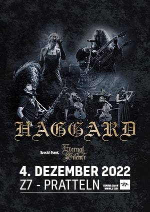MITTELALTERLICHES METAL-ORCHESTERSeit über 20 Jahren verwebt Haggard harte Klänge, mittelalterliche und klassische Musik geschickt zu einem kreativen Mosaik aus echtem symphonischen und orchestralen Metal.In einer Zeit, in der Musikinstrumente mehr und mehr durch Computer ersetzt werden, interpretieren Haggard ihre Musik sowohl im Studio als auch auf der Bühne mit echten klassischen Musikern und Sängern – und der Erfolg gibt ihnen Recht!Special Guest: Eternal SilenceLocation: Z7, Pratteln