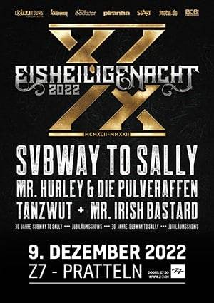 SVBWAY TO SALLY laden zur vermutlich tanzbarsten Ausgabe der beliebten Festivalreihe – mit MR. HURLEY UND DIE PULVERAFFEN, TANZWUT und MR. IRISH BASTARD.Ende 2022 steppt im wahrsten Sinne der (Berliner) Bär: Ab Ende Dezember 2022 laden die Potsdamer von SVBWAY TO SALLY wieder zu ihrer beliebten Indoor-Festivalreihe EISHEILIGE NÄCHTE. Es handelt sich dabei um die wohl tanzbarste Ausgabe bislang – mit MR. HURLEY UND DIE PULVERAFFEN, sowie MR. IRISH BASTARD werden zwei Irish Folk Rock Bands für den richtigen Fusstakt sorgen. Mit TANZWUT komplettieren die Berliner Kollegen und langjährige Weggefährten von SVBWAY TO SALLY das Line Up.Location: Z7, Pratteln